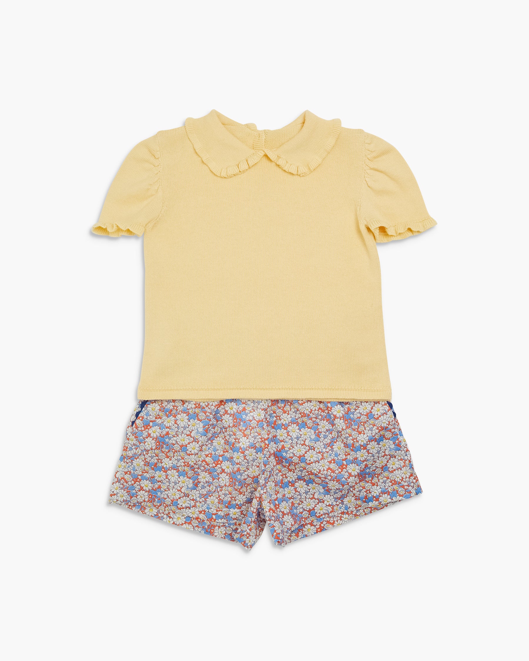 Bring playful style to your daughter's summer collection with the Freesia shorts, featuring a delightful Liberty-inspired print in warm orange and cool blue tones. Made from soft, breathable cotton that keeps her comfortable during warm weather, these shorts boast an elasticated ruffle waistband for a secure yet gentle fit. Practical side pockets trimmed with contrasting dark blue ric rac add both function and charm. Wonderfully versatile, they pair effortlessly with our blouses and knitwear for endless outfit combinations—perfect for sunny adventures, playdates, and holiday fun.
