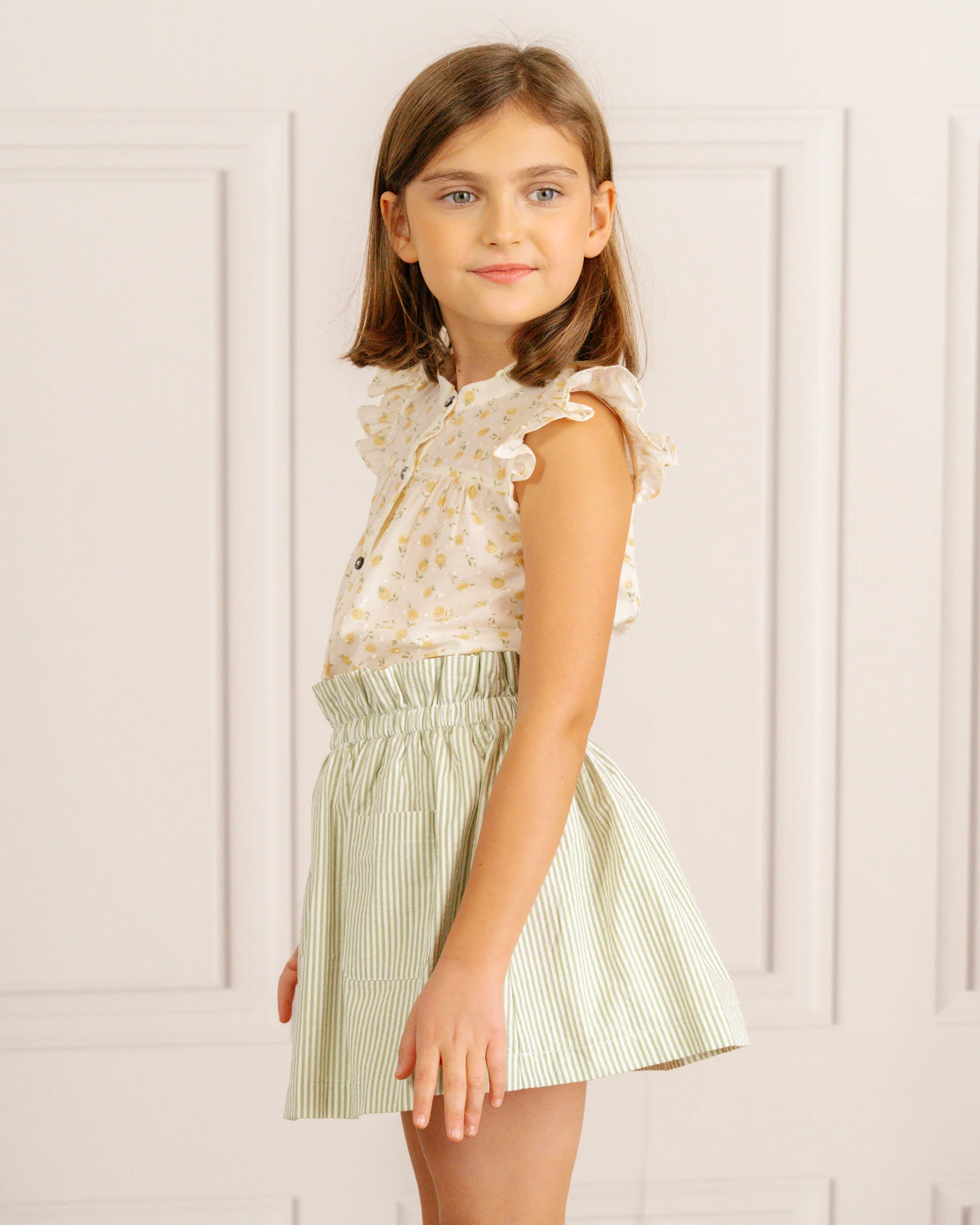 Enhance your child's wardrobe with our Pestana Skirt in khaki seersucker. This charming flared skirt has an elasticated waistband and a soft cotton lining, making it ideal for both formal occasions and casual wear. This adaptable skirt offers both comfort and sophistication, ensuring your child will feel at ease and look stunning for any event. A must-have for any stylish girl, perfect for creating memorable outfits.