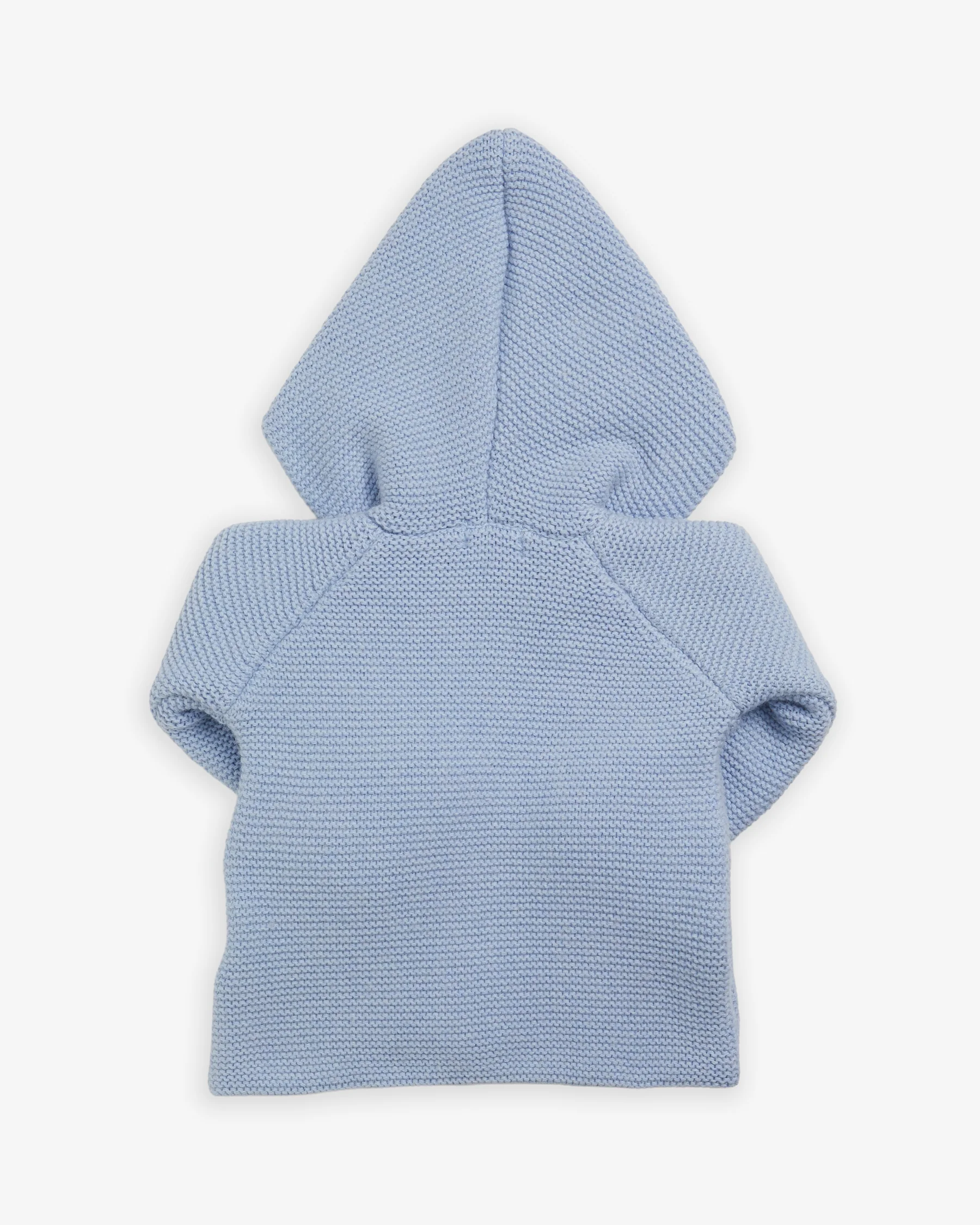 This elegant baby knitted jacket is a perennial wardrobe favourite, cherished by little ones. Made from a refined blend of merino wool and cashmere, it showcases a delicate cable knit pattern and a classic rounded collar. Finished with single-breasted wooden-effect buttons, contrasting off-white cuffs, and practical front pockets, this piece offers both comfort and timeless style.